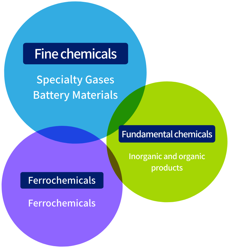 Focusing on the three business areas of fine chemicals, fundamental chemicals, and ferrochemicals, we supply high-quality chemical products that support the world’s most advanced technologies.