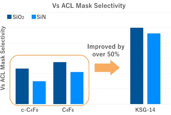 KSG-14 has significantly lower GWP compared to c-C4F8 and it can greatly reduce greenhouse gas emissions derived from process gases released during the semiconductor manufacturing process.