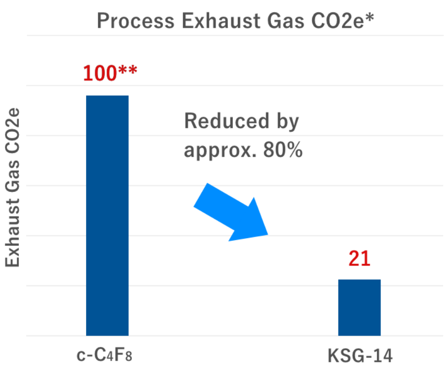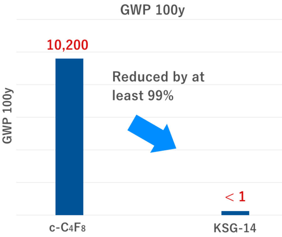 KSG-14 has significantly lower GWP compared to c-C4F8 and it can greatly reduce greenhouse gas emissions derived from process gases released during the semiconductor manufacturing process.