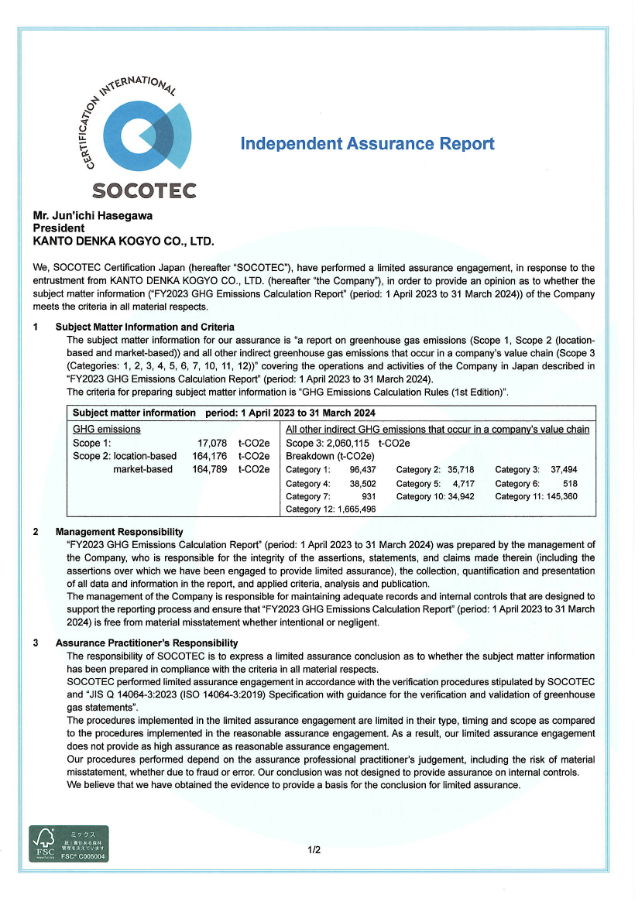 Kanto Denka Kogyo is certified to the ISO14001, ISO9001 and ISO45001 standards, for environmental management systems, quality management systems and occupational health and safety management systems, respectively. Our environmental, quality, and safety systems will work together to supply products that can be used with peace of mind.