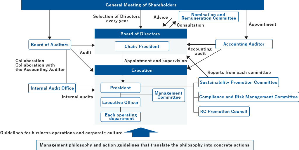 The Company holds a regular meeting of the Board of Directors once a month to make decisions on important matters and supervise the execution of duties by Directors. In order to further strengthen the functions of the Board of Directors and improve management efficiency, the Management Committee, which is attended by the Directors and Executive Officers who execute the Company’s business, meets once a month to flexibly make decisions on basic and important matters related to business execution.