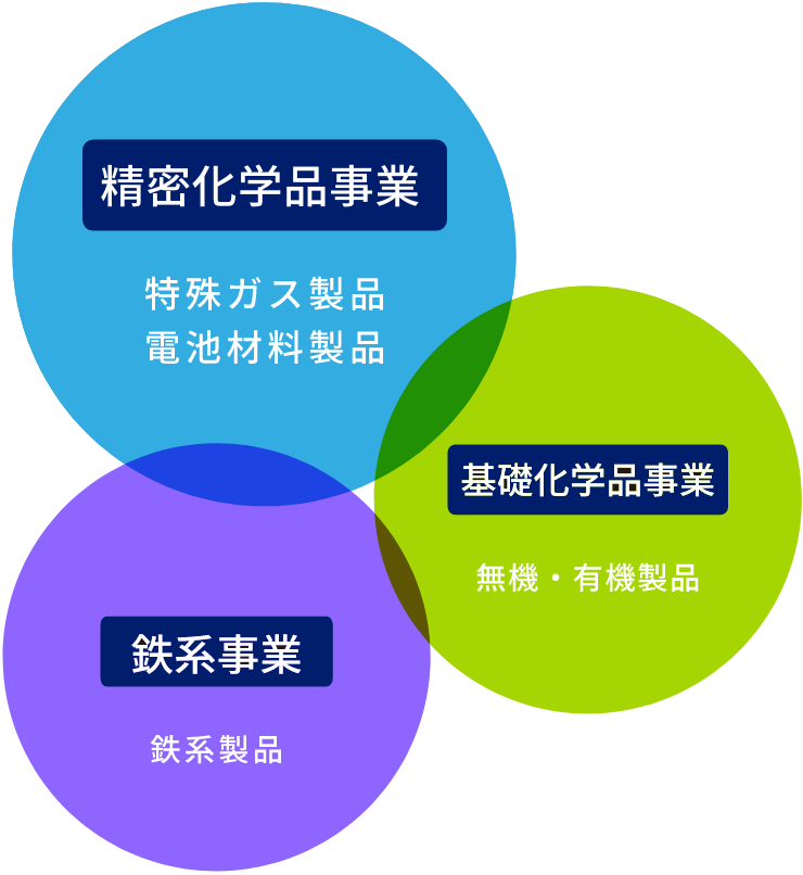 精密化学品事業・基礎化学品事業・鉄系事業という3つの事業領域を中心に、世界最先端の技術を支える高品質な化学製品を供給しています。